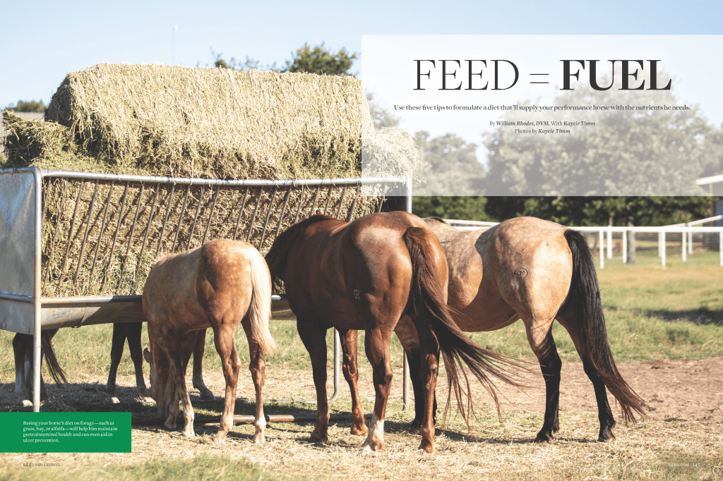 Published in the February 2020 NRHA Reiner, Feed = Fuel offers tips to formulate a diet specifically for a performance horse based on the expert advised of Dr. William Rhodes of Premier Equine Veterinary Services in Whitesboro, Texas.
